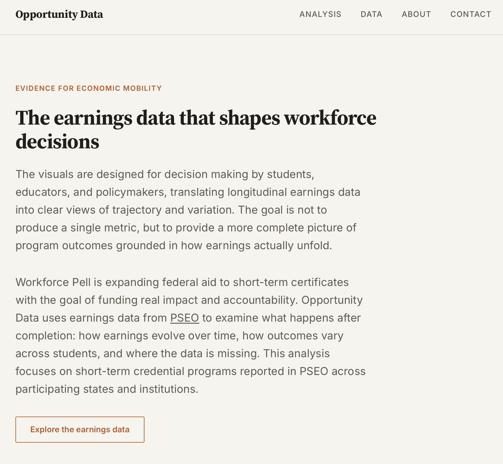 Opportunity Data currently covers short-term certificate earnings across 25 PSEO coalition states, spanning 500+ institutions and 10,000+ program-institution records. The visuals are designed for decision-making by students, educators, and policymakers, using public Census-reported data to show trajectory, variation, and missingness in a way that is easier to interpret. The PSEO Coalition member states page gives a broader sense of the institutions and systems participating in that ecosystem.